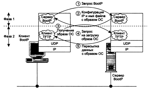 1.5 Фазы ВООТРНесмотря на свое название, протокол ВООТР не используется для фактической пересылки образа операционной системы клиенту ВООТР. Пересылка образа осуществляется отдельным протоколом TFTP (Trivial File Transfer Protocol), который использует в качестве транспорта протокол UDP. Бездисковые рабочие станции загружают образ операционной системы с сервера; другие станции просто используют ВООТР для централизованного назначения IP-адресов, без загрузки системы. На рис.5 "Пример работы bootstrap" изображены фазы, из которых состоит процесс загрузки образа операционной системы. На шаге 1 клиент ВООТР выдает запрос на получение данных конфигурации IP. На шаге 2 сервер ВООТР возвращает данные конфигурации IP и имя загружаемого файла с образом операционной системы. На шаге 3 клиент ВООТР посылает запрос на загрузку образа операционной системы клиенту TFTP. На шаге 4 клиент TFTP посылает серверу TFTP запрос на загрузку образа операционной системы. На шаге 5 сервер TFTP возвращает серию пакетов данных, содержащих образ операционной системы. После принятия образа ВООТР загружает его в память и инициализируется. Отделение ВООТР от механизма пересылки образа операционной системы обладает тем преимуществом, что сервер ВООТР не обязан работать на том компьютере, на котором хранятся образы операционных систем (то есть сервере TFTP). Кроме того, это позволяет использовать ВООТР в ситуациях, когда с сервера принимаются только данные конфигурации, без пересылки образа операционной системы. Возможна ситуация, в которой администратор настраивает рабочую станцию на загрузку разных операционных систем в зависимости от пользователя. В этом случае запрос ВООТР может содержать в поле имени файла обобщенное обозначение - например, "unix" для принятия образа операционной системы Unix, или "default" для загрузки образа операционной системы по умолчанию. Столкнувшись с таким обобщенным запросом, сервер ВООТР обращается к конфигурационной базе данных, находит полностью определенное имя файла и возвращает его в ответе ВООТР. Клиент ВООТР может передать полностью определенное имя локальному клиенту TFTP для принятия образа операционной системы.