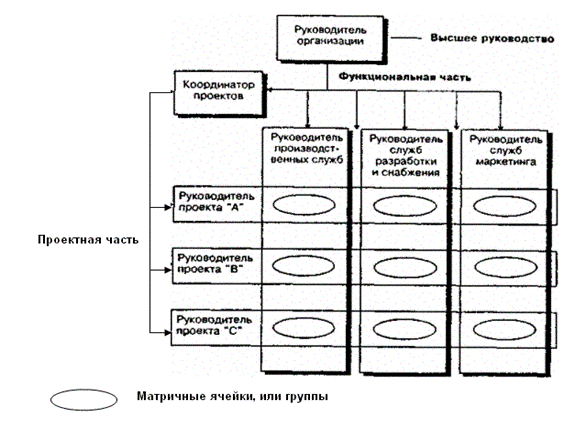 Рисунок 5. Дивизиональная организационная структура В то же время нужно отметить ряд недостатков подобных структур: ¾ противопоставление целей отделений общим целям развития организации; ¾ затруднение осуществления контроля сверху донизу; ¾ возможное ограничение профессионального развития специалистов подразделений, поскольку их коллективы не столь велики, как в случае применения линейно-функциональных структур; ¾ многоуровневая иерархия в рамках самих дивизионов, действие всех недостатков линейно-функциональных структур; ¾ увеличение затрат на содержание управленческого аппарата вследствие дублирования одних и тех же функций в подразделениях и соответствующего увеличения численности персонала; ¾ возможность возникновения конфликтов между подразделениями, в частности в случае дефицита централизованно распределяемых ресурсов. В известной мере недостатки дивизиональной схемы удалось на практике разрешить с переходом к организациям, построенным с включением элементов матричной схемы: управление по проекту, временные целевые группы, постоянные комплексные группы. Матричная департаментизация всегда является комбинацией двух организационных альтернатив, обычно – функциональной и продуктовой. Основной задачей руководства в этих условиях становиться поддержание баланса между двумя структурами. При такой организационной структуре вертикальное направление – управление функциональными и линейными структурами организации; горизонтальное – управление отдельными проектами, программами, продуктами, для реализации которых привлекаются человеческие и иные ресурсы различных подразделений организации.
