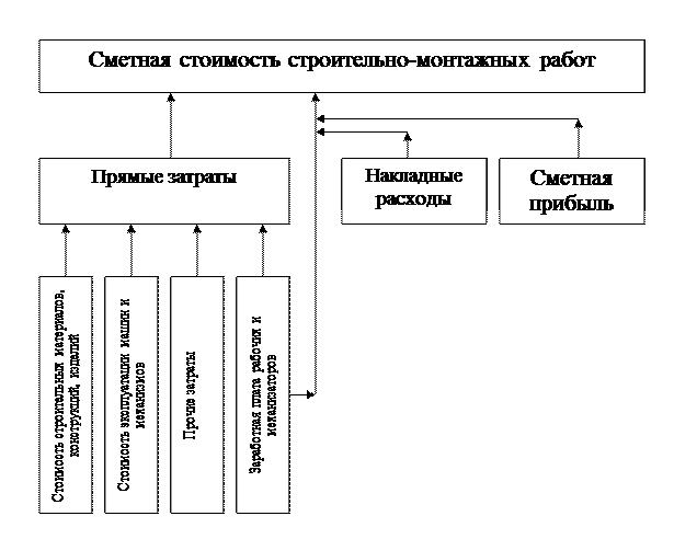 где Основой для расчета индексов служит ресурсно-технологическая модель, предусматривающая регулярное отслеживание изменений средних цен по технологически однородным группам материальных ресурсов. Ресурсно-технологическая модель (РТМ) состоит из двух блоков: [2] 1) Ресурсного, содержащего агрегированные (укрупненные и фиксированные по величине) проектные объемы в натуральном выражении, включающие в себя строительные материалы и изделия. Нормативную величину затрат труда основных производственных рабочих, эксплуатацию основных строительных машин; 2) Стоимостного, включающие в себя базисную величину стоимости единицы объема ресурса и стоимость полного объема. В РТМ объемы материальных и трудовых ресурсов являются фиксированными величинами. Умножая объемы на зарегистрированные в текущем и базисном уровнях цены, а объем трудозатрат – на удельные стоимостные показатели, получаем стоимостную оценку каждого ресурса, а по всей совокупности ресурсов – стоимость строительно-монтажных работ в соответствующий период. 1.4. Структура затрат, определяющих сметную стоимость строительно-монтажных работ .В соответствии с технологической структурой инвестиций в Сиде капитальных вложений и сложившейся на современном этапе производственной деятельностью строительных организаций расходы, входящие в состав сметной стоимости, подразделяются на следующие группы затрат: - строительные (ремонтно-строительные) работы; - монтажные работы; - затраты на приобретение оборудования, мебели, инвентаря; - прочие затраты (проектно-изыскательские, научно-исследовательские, пусконаладочные работы, наладка технологических процессов оборудования и систем). Полную (общую) сметную стоимость можно представить на рис. 1: [3]