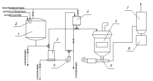 Рис.11 Технологическая схема производства сухих пивных дрожжей: 1 – чан для дрожжевой суспензии; 2 – сетчатый цедильник; 3 – сепаратор; 4 – бак–накопитель; 5 –сушилка; 6 – пневмотранспорт; 7 – циклон; 8 – сборник–накопитель продукта; После периода главного брожения остаточные пивные дрожжи из бродильни передаются в чан, где разбавляются холодной водой в отношении 1:4 и выстаиваются при непрерывном перемешивании в течении 10 минут. Полученная дрожжевая суспензия подаётся через сетчатый фильтр на сепаратор, где происходит разделение на промывочную воду, которая уходит в канализацию, и помытую дрожжевую суспензию, которая насосом подаётся в бак – накопитель. Затем, после опустошения чана дрожжевая суспензия подаётся обратно в чан, где к ней добавляется в пропорции 4:1 1% раствор NaCl. В солевом растворе дрожжевая суспензия выдерживается в течении 30 минут при постоянном перемешивании. После обработки солевым раствором смесь подаётся на сепаратор, где отделяется солевой раствор, уносящийся в канализацию от обезгореченной дрожжевой суспензии, которая насосом подаётся в бак – накопитель. Далее смесь снова поступает в чан для помывки от солевого раствора водой в пропорции 1:4 в течении 10 минут, затем через сепаратор и насос обратно в бак – накопитель. Цикл промывки от соли повторяется 3 раза. В конце промывки дрожжевая суспензия из бака – накопителя постепенно поступает для сушки в двухвальцовую вакуум – сушилку. На вальцах дрожжи высыхают при пониженном давлении и температуре 40 – 45Co . Толщина сходящей с вальцов плёнки сухих дрожжей согласно требованиям не должна превышать 0,1 – 0,2 мм.