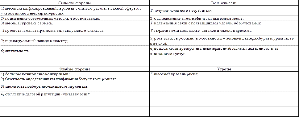 Для всестороннего изучения рыночной ситуации, в которой будет работать компания и оценки возможностей и угроз, с которыми она может столкнуться в ходе своей работы, а также для формирования стратегий поведения с учетом внутренних и внешних факторов среды, используется методика SWOT- анализа, который представлен в Таблице 1: