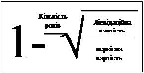 Приклад 1. Умови прикладу: - первісна вартість об ’ єкта основних засобів – 5000 грн.; - ліквідаційна вартість – 500 грн.; - термін корисного використання, що передбачається, - 4 роки. Потрібно визначити: · вартість, що амортизується; · річну норму амортизації; · щомісячну суму амортизації (цей показник необхідно розрахувати, оскільки амортизація нараховується щомісяця). Виконуємо відповідні розрахунки і отримуємо шукані величини: · вартість, що амортизується, - 5000 грн. – 500 грн. = 4500 грн.; · річна норма амортизації – 4500 грн. : 4 роки = 1125 грн.; · щомісячна сума амортизації – 1125 грн. : 12 місяців = 93.75 грн. Таким чином, при застосуванні прямолінійного методу вартість об’єкта, що амортизується, рівномірно списується (розподіляється) протягом терміну його корисного використання. Метод заснований на припущенні, що сума нарахованої амортизації залежить від терміну (тривалості) експлуатації об’єкта основних засобів. При застосуванні цього методу: ¨ річна сума амортизації однакова протягом усіх років експлуатації об’єкта; ¨ сума зносу накопичується рівномірно; ¨ залишкова вартість об’єкта основних засобів рівномірно зменшується до рівня ліквідаційної вартості. 3.2 . Метод зменшення залишкової вартості За ПБО-7 це метод, «за яким річна сума амортизації визначається як добуток залишкової вартості об ’єкта на початок звітного року або первісної вартості на дату початку нарахування амортизації та річної норми амортизації. Річна норма амортизації (у відсотках) обчислюється як різниця між одиницею та результатом кореня ступеня кількості років корисного використання об ’єкта з результату від ділення ліквідаційної вартості об ’єкта на його первісну вартість. Нарахування амортизації проводиться щомісячно.” Зобразимо зміст норм стандарту у вигляді формул: