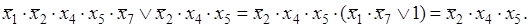 Правило поглощения. Так же как и склеивание, поглощение может быть двух видов. Правило поглощения для двух элементарных конъюнкций формулируется так: логическую сумму двух элементарных произведений разных рангов, из которых одно является собственной частью другого, можно заменить слагаемым, имеющим меньший ранг. Это правило является следствием распределительного закона 1-го рода. Доказывается оно посредством вынесения за скобку общей части слагаемых. В скобках останется логическая сумма некоторого выражения и единицы, равная в свою очередь также единице, что и доказывает справедливость правила. Например,