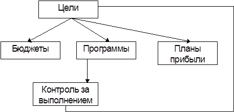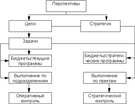 рис.1. Схема долгосрочного планированияКак видно из схемы (рис. 2), перспективы и цели связаны между собой для выработки стратегии. Текущие программы (бюджеты) ориентируют оперативные подразделения предприятия в их повседневной работе, направленной на обеспечение текущей рентабельности; стратегические программы и бюджеты закладывают основы будущей рентабельности, что требует создания специальной системы исполнения, построенной на управлении проектами. [6]