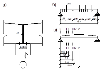 Рисунок 2. Расчетная схема балки и расположение сечений: а – расположение анкерных болтов; б – схема загружения балки; в – расположение расчетных сечений