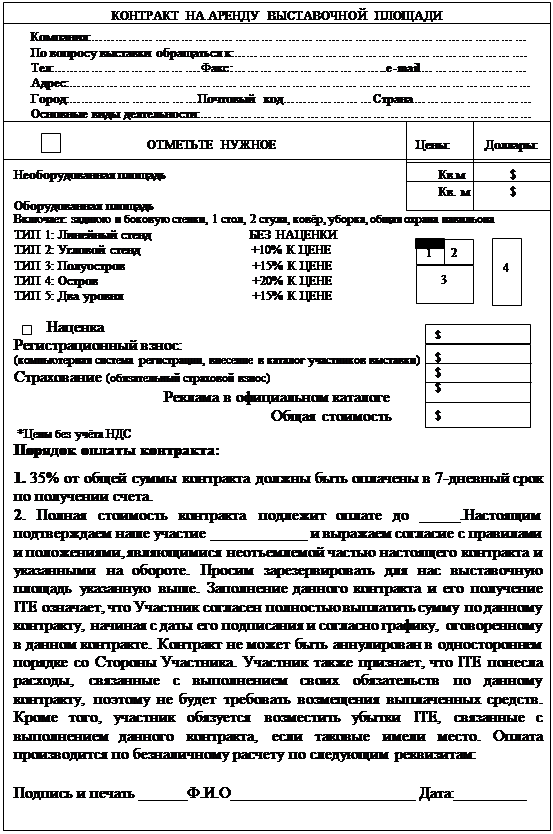 A. доступ с одной стороны, минимум 9 м2 без наценки B. доступ с двух сторон, минимум 18 м2 + 10% к базовой ставке C. доступ с трех сторон, минимум 30 м2 + 15% к базовой ставке D. доступ с четырех сторон, минимум 60 м2 + 20% к базовой ставке1 Некоторые фирмы устанавливают одинаковые для всех участников цены аренды площади (здесь действует простой принцип: «кто раньше пришел, тот и занимает лучшие места»). Теперь, необходимо проанализировать каким образом распределяются «хорошие места» в павильоне. Безусловно, это места напротив главного входа в павильон или выходящее на «тропы», по которым проходят основные потоки посетителей (см. приложение 1). Но, в тоже время, существуют и «плохие» места, за счёт аренды которых фирма имеет возможность сэкономить (см. приложение 2). За определенный фиксированный срок, не позднее, чем за месяц до начала выставки заполняется и посылается в адрес оргкомитета заявка на участие в выставке. В ней указываются все реквизиты фирмы (страна, адрес/телефон, номер расчётного счета) Суть заявки - предварительная регистрация и бронирование выставочной площади. Письмо-заявка подтверждает согласие фирмы с положениями данной выставки и правилами ее проведения. Это в своем роде договор между сторонами. По получении заявки, в ответ посылается подтверждение о регистрации фирмы в каталоге участников и выделении требуемого количества места при условии оплаты. Оплата участия должна быть произведена в течении 5-10 дней. Подтверждение гарантирует получение базового набора услуг (см. приложение 3). Итак, выбрав и забронировав площадь, предприятие переходит к процедуре оформления стенда, роль которого на пути к успеху велика, ведь стенд – это образ предприятия-экспонента в миниатюре. 2.2. Оформление выставочного стенда, как один из элементов затрат. Итак, рассмотрев статьи затрат на участие в выставке, можно сделать вывод, что затраты на монтаж и оформление стенда – дорогое удовольствие. И в то же время, турпредприятие всё равно должно стремится к покупке лучшего места для стенда и его оригинальному оформлению. Ведь всё это определяет будущую прибыль и успех предприятия. Исходя из этого, в данном пункте, я предлагаю рассмотреть вопрос оформления и расположения выставочного стенда. Выставочный стенд — это лицо фирмы. Поэтому успех участия туристского предприятия в выставочных мероприятиях во многом зависит от искусства оформления выставочной экспозиции. Встречаются руководители туристских фирм, которые очень требовательно относятся к рекламным объявлениям в газетах, журналах, и в то же время не думают, о том, как выглядит их выставочная экспозиция. Но ведь для потенциальных клиентов или партнеров чтение газет с рекламой — занятие ежедневное, а посещение стенда фирмы может стать событием. Следовательно, необходимо приложить все усилия, смекалку, опыт, интеллект, чтобы это событие было запоминающимся. Каждый экспонент должен стремиться расположить стенд: 1. напротив и справа от главного входа, 2. на центральных внутренних проходах, 3. в углах, 4. вблизи от «активных» экспонентов и специализированных помещений для проведения различных мероприятий. И, наоборот, следует избегать размещения стенда: 1. вдали от выходов и центральных проходов, 2. в задней части зала, 3. позади больших колонн, лестниц, 4. лицом в противоположную сторону от места, где 