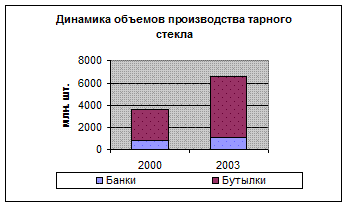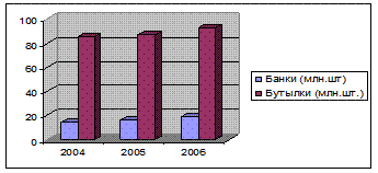Покупатель оплачивает поставляемый продавцом товар по цене, указанной в счете выставленным продавцом. Деньги предприятие – потребитель перечисляет на расчетный счет при безналичном расчете. В основном же используется частичная предоплата, а остальное – под реализацию. В сравнении с конкурентами цена на стеклобанки средняя. Главным достоинством и преимуществом продукции ООО «Брянск-Стекло» является качество продукции , которое не уступает импортным аналогам, и что позволяет конкурировать с другими предприятиями-производителями стеклотары. 4. КОМПЛЕКСНОЕ ИССЛЕДОВАНИЕ РЫНКА ПРОДУКТА 4.1. Анализ спроса и предложения на товары и услуги на выбранном рынке и тенденций его развития Предметом настоящего исследования является рынок тарного стекла. Под тарным стеклом понимается стеклянная посуда, предназначенная для хранения и транспортировки продукции. В данном исследовании рассматриваются две основных товарных группы, подпадающих под это определение: банки стеклянные (код ОКП 735213), бутылки стеклянные (код ОКП 734001).Сортовая посуда, в том числе из хрусталя или стекла, не рассматривается в рамках данного исследования. В 2006 году реальная емкость рынка тарного стекла составила 14373,12 млн. шт., из них 11997,018 млн. шт. бутылок и 2376,102 млн. шт. банок. В период с 2003 по 2006 гг. объем рынка тарного стекла вырос в физическом измерении на 66%, причем этот рост был обеспечен преимущественно ростом сегмента стеклянных бутылок (75%), в то время как объем рынка тары для консервирования (банок) изменился на 34%. Основную роль в увеличении реальной емкости рынка играют российские производители – темпы роста производства тарного стекла за указанный период составили 82%. В 2006 году было произведено 8400,717 млн. шт. бутылок, что на 93% больше, чем в 2003 году, и 2054,9 шт. банок, что на 40% превышает объем 2003 года. Импорт тарного стекла в 2006 году составил 575,32 тыс. тонн по массе, или 237,31 млн. долл. в стоимостном выражении. В период с 2003 по 2005 год наблюдается рост объемов импорта, отстающий от общего роста объема рынка. В 2006 году данная тенденция сохраняется в сегменте бутылок, в то время как объемы импорта банок начинают сокращаться (на 34% по массе и 28% по стоимости). Доля импортной продукции на российском рынке (в физическом измерении) сокращается с 23% до 17%, причем изменение структуры импорта свидетельствует о том, что поставками из-за рубежа компенсируется нехватка высококачественной и относительно дорогой тары маленького объема. Экспорт тарного стекла в 2006 году составил 191,71 тыс. тонн по массе, или 50,35 млн. долл. по стоимости. С 2003 по 2005 год наблюдался снижение объемов экспорта банок, которое сменяется в 2006 году значительным ростом (110% по массе и 100% по стоимости с 2005 по 2006 годы). Экспорт бутылок, выросший более чем в два раза с 2003 по 2005 годы, замедлил темпы роста в 2006 году (3% по массе и 19% в стоимостном выражении). Динамика объемов производства тарного стекла в России представлена в таблице 5. Таблица 5 Динамика объемов производства тарного стекла в России, 2003-200 6