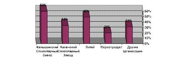 Из анализа сложившейся ситуации на ООО «Брянск-Стекло» видно, что для производства стеклотары на мировом уровне предприятию не хватает хорошо оснащенной новейшим оборудованием производственной базы. У предприятия также наблюдается низкая кредитоспособность, низкая ликвидность и платежеспособность, недостаточно производственных запасов. В результате анализа было выявлена такая слабая сторона предприятия как отсутствие отдела маркетинга. 6. Продукт и товарная политика как инструмент маркетинга6.1. Анализ продукта на базе суждений потребителя Начальным этапом формирования товарной политики предприятия служит определение отношения к выпускаемой продукции. Самое известное орудие сбора информации – анкета, которая включает в себя ряд вопросов. Вопросы могут быть открытые и закрытые. Открытые вопросы дают возможность отвечать своими словами. Закрытые вопросы также могут быть нескольких видов (альтернативные, с выборочным ответом, со шкалой Лайкерта, оценочной шкалой и др.). В анкете будут использованы по преимуществу закрытые вопросы. Цель проведения анкетирования – выяснить потребительские предпочтения относительно стеклотары, и на каких критериях они основываются, выяснить, возможно, ли увеличения числа покупателей. Следующим этапом явилось составление выборки. Выборка – группа людей, призванная олицетворять собой выборку в целом. Выборка использовалась неслучайная. Опрашивать необходимо руководителей предприятий, которые покупают продукцию ОАО «Литий» . После проведения анкетирования необходимо проанализировать полученные сведения. Для анализа можно использовать простые статистические методы и нет необходимости запутывать управляющих отдела маркетинга сложностью методов, так как в них нет особой необходимости. В опросе приняло участие 35 промышленных предприятий. Опрос показал, что 60% из опрошенных предприятий при покупке стеклотары обращаются в "Камышинский Стеклотарный Завод" ЗАО, 34% покупают стеклотару, производства "Каменский Стеклотарный Завод" ОАО, 49% респондентов обращаются в ОАО "Литий", 20% предприятий покупают продукцию ОАО "Югроспродукт", а 31% респондентов обращаются в другие организации (рис 6).