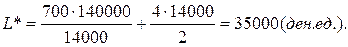 Так как d2 L/dq2 >0 (достаточный признак экстремума), то для всех q>0 выражение (2.2) является минимумом функции затрат (2.1). Уравнение (2.2) известно под многими названиями. Его называют формулой наиболее экономной величины заказа, формулой Уилсона, формулой квадратного корня. Чтобы найти оптимальные параметры работы системы, поставляем значение q* в соответствующие выражение. Получаем, что оптимальная стратегия предусматривает заказ q* через каждые единиц времени. Наименьшие суммарные затраты работы системы в единицу времени Пример 1. Жидкие продукты нескольких видов разливаются в пакеты на одной линии упаковки. Затраты на подготовительно-заключительные операции составляют 700 ден. ед., потребность в продуктах составляет 140000 л в месяц, стоимость хранения 1 л в течение месяца – 4 ден. ед. Определить оптимальные параметры системы. Сравнить минимальные затраты с затратами при действующей системе разлива одного продукта в течение трех дней.