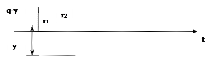 2.3. Модель с учетом неудовлетворенных требований. В некоторых случаях, когда потери из-за дефицита сравнимы с издержками хранения, дефицит допускается. Пусть требования, поступающие в момент отсутствия запаса, берутся на учет. Обозначим через y максимальную величину задолженного спроса рис. 2.3. Максимальная величина наличного запаса Y = q-y расходуется за время r1 (время существования наличного запаса), а затем поступающие требования ставятся на учет в течение времени r2 (время дефицита). При поступлении очередной партии в первую очередь удовлетворяется задолженый спрос, а затем пополняется запас. Убытки, связанные с дефицитом единицы запаса в единицу времени, составляют d. Затраты на хранение продукции пропорциональны средней величине запаса (q-y)/2 и времени его существования (q-y)/v; аналогично убытки от дефицита пропорциональны средней величине дефицита y/2 и времени его существования y/v. Средние издержки работы системы в течение цикла, включающие затраты на размещение заказа, содержание запаса и потери от дефицита