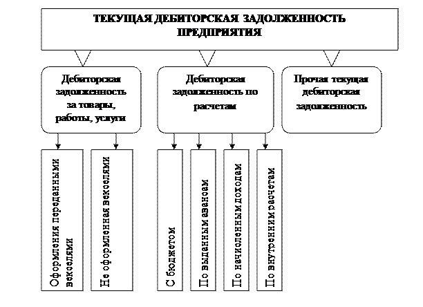 Рис. 1. Состав основных видов текущей дебиторской задолженности предприятия[6] Как было сказано, под кредиторской задолженностью понимается задолженность данной организации другим организациям и физическим лицам – кредиторам (платежи за приобретенную продукцию, потребленные услуги, задолженность по платежам в бюджеты всех уровней и прочие). Так, кредиторская задолженность может возникнуть, если материалы в организацию поступают раньше, чем она их оплатила. В состав кредиторской задолженности также включается задолженность своему трудовому коллективу по оплате труда, задолженность перед органами социального и медицинского страхования (возникает вследствие того, что начисление налогов и платежей происходит раньше, чем осуществляются соответствующие платежи) банковские ссуды и неоплаченные счета других предприятий и прочие. К долгосрочным пассивам относятся: долгосрочные займы, отражающие долгосрочные кредиты (кроме банковских) и другие привлечённые средства на срок более одного года, в том числе по выпущенным предприятием долгосрочным облигациям и выданным долгосрочным векселям. К краткосрочным пассивам относятся обязательства, которые покрываются оборотными средствами или погашаются в результате образования новых краткосрочных обязательств. Эти обязательства погашаются в течение сравнительно короткого периода времени (обычно в течение года). Краткосрочные обязательства приводятся в балансе либо по их текущей цене, отражающей будущие затраты наличных средств для погашения этих обязательств, либо по цене на дату погашения долга.[7] В краткосрочные обязательства включаются такие статьи, как счета и векселя к оплате, возникающие в результате предоставления предприятию кредита, долговые свидетельства о получении компанией краткосрочного займа; задолженность по налогам, являющаяся по существу формой кредита, предоставляемого государством данной компании; задолженность по заработной плате; часть долгосрочных обязательств, подлежащая погашению в текущем периоде. Основной причиной возникновения как дебиторской, так и кредиторской задолженности является товарный кредит. Товарный (коммерческий) кредит, предоставляемый предприятиям в форме отсрочки платежа за поставленные им сырье, материалы или товары, получает все большее распространение в современной коммерческой и финансовой практике. Рассмотрение сущности товарного кредита является важной частью изучения дебиторской и кредиторской задолженности.[8] Для привлекающих его предприятий он имеет ряд преимуществ в сравнении с другими источниками формирования заемного капитала, которые заключаются в следующем: 1. Товарный (коммерческий) кредит является наиболее маневренной формой финансирования за счет заемного капитала наименее ликвидной части оборотных активов — производственных запасов товарно-материальных ценностей. 2. Он позволяет автоматически сглаживать сезонную потребность в иных формах привлечения заемных средств, так как большая часть этой потребности связана с сезонными особенностями формирования запасов сырья. 3. Этот вид кредитования не рассматривает поставленные сырье, материалы и товары как имущественный залог предприятия, позволяя ему свободно распоряжаться предоставленными в кредит материальными ценностями. 4. В этом вид