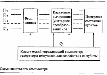 Схема квантового компьютера представлена на рисунке. До начала работы компьютера все кубиты (квантовые частицы) должны быть приведены в состояние
