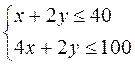 4) Набор В отвечает полной занятости ресурсов, так как он является решением системы уравнений 10х = 600 и 2у = 40. Пример 4 . Производственные возможности Ивана: (2;2) и (3; 4). Производственные возможности Марии: (1;2) и (3;2). Создав семью, Иван и Мария продолжают производить продукцию независимо друг от друга. Найти производственные возможности семьи. Решение: Необходимо сложить каждую производственную возможность Ивана с каждой производственной возможностью Марии: (2 +1; 2 + 2), (3 + 1;4+2), (2+ 3; 2 + 2), (3 + 3; 4 + 2). Пример 5 . В системе производятся сухари и кексы. Тысяча сухарей производится из 1 кг сахара и 4 кг муки, сотня кексов – из 2 кг сахара и 2 кг муки. Имеется 40 кг сахара и 100 кг муки. Найти: а) границу производственных возможностей; б) производственную возможность, отвечающую полному использованию сахара и муки. Решение: Обозначим через х выпуск сухарей (тыс. шт.), а через у – выпуск кексов (сотен шт.). Тогда множество производственных возможностей задается системой неравенств: