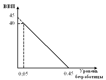 Рис. 3.1. Кривая Оукена Пример 3. Увеличение уровня безработицы с 8 до 10% привело к сокращению ВВП с 2400 до 2000 млрд. руб. Найти потенциальный ВВП. Решение (способ 1): Обозначим потенциальный ВВП через х , а естественный уровень безработицы через а . Тогда, подставляя начальные и конечные значения ВВП и уровня безработицы в уравнение Оукена, получим систему уравнений с неизвестными х и а : (х –2400)/х =2,5(0,08 – а ), отсюда 0,8х +2,5ах =2400. (х –2000)/х =2,5(0,1– а ), отсюда 0,75х +2,5ах =2000. Вычитая из первого уравнения второе, получим: 0,05х =400, отсюда х = 8000 (млрд руб.) Способ 2. Преобразовав уравнение Оукена, получим, что потенциальный ВВП может быть рассчитан следующим образом: 1/2,5 * изменение ВВП / изменение уровня безработицы. Подставляя числовые данные из условия задачи, получим значение потенциального ВВП: [1* (2400 2000)] / [2,5 * (0,1 – 0,08)] = 8000 (млрд руб.). ЗАДАНИЯ1. Увеличение уровня безработицы с 6 до 10% привело к сокращению ВВП с 4500 до 4100 млрд руб. Найти потенциальный ВВП. 2. Фактический уровень безработицы составил 8%. Естественный уровень равен 6%. Потенциальный ВВП равен 25000 млрд руб. Найти отставание ВВП. 3. Увеличение уровня безработицы на 1% приводит к сокращению ВВП на 75 млрд руб. Найти потенциальный ВВП. ТЕСТЫ1. Безработным не может быть признан человек, который: