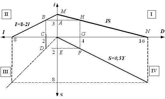 Рис. 9.1. Кривая IS Пример 2. Функция инвестиций I =8 – 2i (i – в %), функция сбережений S = 0,5Y. Построить кривую IS. Решение. Способ 1 (аналитический). Из условия равновесия I = S следует: 8 – 2i = 0,5Y, отсюда Y = 16 – 4i . Поскольку автономные сбережения равны нулю, равновесие на рынке благ возможно при чрезвычайно малых значениях дохода. Поэтому кривая IS представляет собой отрезок, задаваемый полученной формулой и соединяющий точки на координатных осях «доход» и «ставка процента». Способ 2 (графический). Возьмем координатную плоскость и будем откладывать: · доход – на координатной оси, направленной вправо; · ставку процента – на координатной оси, направленной вверх; · инвестиции – на координатной оси, направленной влево; · сбережения – на координатной оси, направленной вниз. Во IIм квадранте изобразим график функции инвестиций. В IIIм квадранте проведем биссектрису координатного угла. В IVм квадранте изобразим график функции сбережений. В Iм квадранте будем строить кривую IS. Возьмем произвольную ставку процента, меньшую 4% – максимальной величины ставки процента (например, 3%). Выбранной ставке процента отвечает точка А на оси «ставка процента». С помощью графика инвестиций определим объем инвестиций, отвечающий ставке процента 3%. Этот объем инвестиций равен 2, ему соответствует точка С на оси «инвестиции». С помощью биссектрисы IIIго координатного угла определим объем сбережений, равный объему инвестиций при ставке 3%. Данному объему сбережений отвечает точка Е на оси «сбережения». С помощью графика сбережений определим доход, отвечающий данному объему сбережений. Этот доход равен 4, ему соответствует точка G на оси «доход». В первом квадранте найдем точку Н , у которой ордината равна исходному значению ставки процента (3%), а абсцисса – соответствующему равновесному объему дохода (4). Полученная таким способом точка Н принадлежит кривой IS. Выполнив описанный алгоритм для нескольких значений ставки процента, лежащих в пределах от 0 до 4%, получим кривую IS . На рисунке она изображена отрезком М (рис. 9.2).