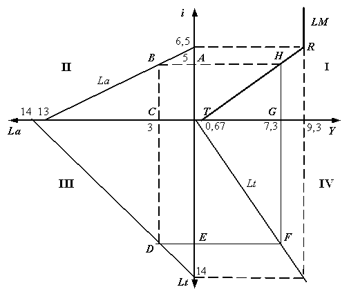 Множество пар ( Y; I), удовлетворяющих соотношению (9.2), называют LM-линией . Данное соотношение называют условием равновесия на рынке денег. Пример 1. Спрос на деньги для сделок Lt = 0,2Y, спекулятивный спрос на деньги La =12–4i (i – в %), предложение денег равно М=6. Построить LM-линию. Решение (аналитический способ). 1) Функция положительна, если i < 3, и равна нулю, если i ³3. 2) Если i <3,то Lt + La =0,2Y+12–4i , если i≥3, то Lt + La =0,2Y. 3) Условие равновесия (9.2) имеет вид: 0,2Y+12– 4i =6, отсюда Y=20i – 30, если i <3 и 0,2Y = 6, или Y=30; если i ≥3. 4) Если Y = 0, то i = 1,5 минимальная равновесная ставка процента. Пример 2. Спрос на деньги для сделок задается формулой Lt =1,5Y, спекулятивный спрос на деньги равен La = 13 – 2i (i – в %). Предложение денег М=14. Постройте LМлинию. Решение (графический способ). Возьмем координатную плоскость и будем откладывать: · доход – на координатной оси, направленной вправо; · ставку процента – на координатной оси, направленной вверх; · спекулятивный спрос на деньги – на координатной оси, направленной влево; · спрос на деньги для сделок – на координатной оси, направленной вниз. Во II квадранте изобразим график функции спекулятивного спроса на деньги (La ). В III квадранте проведем отрезок, соединяющий точки (0; 14) и (14; 0) на координатных осях. Он расположен под углом 45° к осям. В IV квадранте изобразим функцию спроса на деньги для сделок (Lt ). В I квадранте будем строить кривую LМ (рис. 9.3). Возьмем произвольную ставку процента, меньшую 6,5% – максимальной величины ставки процента (например, 5%). Выбранной ставке процента отвечает точка A на оси «i ». С помощью графика функции спекулятивного спроса на деньги определим величину такого спроса при ставке процента 5%. Этот объем равен 3, ему соответствует точка С на оси «L a ». С помощью отрезка, достроенного в III квадранте, определим объем спроса на деньги для сделок, который в сумме с объемом спроса, на деньги как имущество дает величину предложения денег (М=14). Искомый объем спроса равен 11 (14 – 3=11), ему отвечает точка Е на оси «Lt ». С помощью графика функции спроса на деньги для сделок определим доход, отвечающий данному объему спроса для сделок. 1,5Y=11 Þ этот доход равен 7,3, ему соответствует точка G на оси «Y ». В первом квадранте найдем точку H , у которой ордината равна исходному значению ставки процента (5%), а абсцисса – соответствующему равновесному объему дохода (7,3). Полученная таким способом точка H принадлежит кривой LМ. Для того чтобы более детально определить расположение кривой LM, найдем ее точки, отвечающие двум крайним возможным значениям ставки процента. При максимальной ставке процента, равной 6,5%, объем спекулятивного спроса на деньги равен нулю (La =13–2*6,5=0), а объем спроса на деньги для сделок максимален и равен 14. Данному «переломному» состоянию экономики отвечает точка R на кривой LM. Ставкам процента, превышающим 6,5%, отвечает вертикальный участок кривой LM. При минимальной ставке процента (i =0) объем спекулятивного спроса на деньги максимален и равен 13 (La =13–2*0=13), а спрос на деньги для сделок равен 1. Соответствующий равновесный доход равен 0,67 (1:1,5). Данному состоянию экономики отвечает точка T на кривой LM, лежащая на оси «Y ».