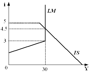 Рис. 9.4. Одновременное равновесие на товарном и денежном рынках Область, находящаяся над кривой IS, показывает превышение AS над AD (Ys > Yd). Все точки под кривой IS показывают, что Ys < Yd. Все точки под кривой LM показывают, что Ms > Md, а все точки над кривой LM – Md > Ms. Рассматривая модель IS- LM , можно сделать некоторые выводы. При росте равновесной процентной ставки объем валового продукта должен сокращаться, при снижении – увеличиваться. При росте инвестиций кривая IS сдвигается вправо, что ведет к росту валового продукта и росту процентной ставки, и наоборот. При росте денежной массы кривая LM сдвигается вправо, снижается процентная ставка и растет валовой продукт. При сокращении денежной массы кривая LM сдвигается влево, растет ставка процента и сокращается валовой продукт. Ликвидная ловушка имеет место при избытке денежной массы, когда процентные ставки стремятся к нулю. В этом случае в экономике развивается инфляция, порожденная избыточной денежной массой. Так как деньги ничего не стоят или стоят очень мало, то спрос на них становится бесконечным. В этом случае увеличение или сокращение денежной массы мало влияет на рост спроса, процентные ставки и динамику реального ВВП. Экономика становится практически неуправляемой, кредитно-денежные рычаги не работают. Используя рычаги кредитно-денежной политики, следует ввести экономику в режим положительных процентных ставок. Только в этом случае экономика будет адекватно реагировать на рыночные сигналы и государственное регулирование. Модель IS- LM может быть хорошим ориентиром при планировании и осуществлении макроэкономической политики государства. Пример 1. Инвестиции равны I=10–2i , сбережения равны S = 0,1Y–2, спрос на деньги для сделок равен Lt = 0,2Y, спекулятивный спрос равен La =12 – 4i , предложение денег М=6. Построить линии IS и LM. Найти равновесные ставку процента и доход. Решение: 1) Вывод кривой IS: I= S , 10–2i =0,1Y–2, отсюда Y = 120–20i при i ≤5. 2) Вывод кривой LM : Lt + La =М , 0,2Y +12 – 4i =6, отсюда Y =20i – 30 при i <3, Y=30 при i ≥3. 3) Кривая IS не пересекает наклонный участок кривой LM: если 120 – 20i =20i –30, то i = 3,75 >3. 4) Кривая IS пересекает вертикальный участок кривой LM: если 120 –20i = 30, то i = 4,5 < 5. Равновесная ставка процента равна 4,5%, равновесный доход – 30 (рис. 9.5).