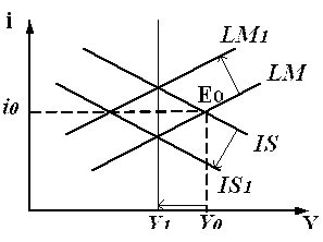 Рис. 9.3. Построение кривой LM ЗАДАНИЯ1. Спрос на деньги для сделок равен Lt = 0,5Y, спекулятивный спрос на деньги равен Lа =12/i , предложение денег равно M = 4. а) Построить кривую LМ. б) В каких пределах изменяется равновесный доход? в) Найти изменение равновесного дохода при увеличении ставки процента с 20 до 24%. 2. Спрос на деньги для сделок равен Lt = 0,4Y, спекулятивный спрос на деньги равен Lа = 16 – 2i , предложение денег равно M = 20. а) Построить кривую LМ. б) Построить кривую LМ, если в результате распространения системы электронных платежей спрос на деньги для сделок сократился вдвое. в) Построить LMлинию, если в результате действия Центрального банка предложение денег сократилось вдвое. 3. Спрос на деньги для сделок составляет 40% дохода, спекулятивный спрос на деньги равен 16 – 4i. Предложение денег превышает максимальный спрос на деньги как имущество. Найти изменение равновесного дохода при увеличении равновесной ставки процента: а) с 2 до 3%, б) с 3 до 6%, в) с 5 до 6%. 4. Спрос на деньги для сделок равен Lt = 0,4Y, спекулятивный спрос на деньги равен Lа = 30 – 6i. При каком предложении денег равновесие: а) достигается при ставке процента 2% и доходе 55; б) достигается при ставке процента 6% и доходе 30; в) невозможно при ставках процента, меньших 2%? 5. Спрос на деньги для сделок равен Lt = 0,5Y, спекулятивный спрос на деньги равен Lа = а – 2i, предложение денег равно M = а + b. а) Построить кривую LM. б) Найти новые пределы изменений равновесной ставки процента и дохода после того, как в результате банкротства ряда компаний произошел параллельный сдвиг графика спекулятивного спроса на деньги, причем максимальный спрос на них увеличился вдвое. в) Как необходимо изменить предложение денег, чтобы равновесие достигалось при ставке процента i = 0,1а и доходе Y = 0,4а? 9.3 Модель IS-LM Если кривые IS и LM пересекаются ( IS= LM) , то в точке их пересечения имеет место совместное равновесие на товарном и денежном рынках . Это такое состояние экономики, при котором для данной ставки процента (i0 ) и уровня дохода (Y0 ) достигается равновесие на обоих рынках одновременно (рис. 9.4). Точка Е(i0 ,Y0 ) – точка равновесия, в которой, во-первых, нет излишка и дефицита денежных средств в обращении и, во-вторых, все свободные деньги связаны и активно инвестируются.