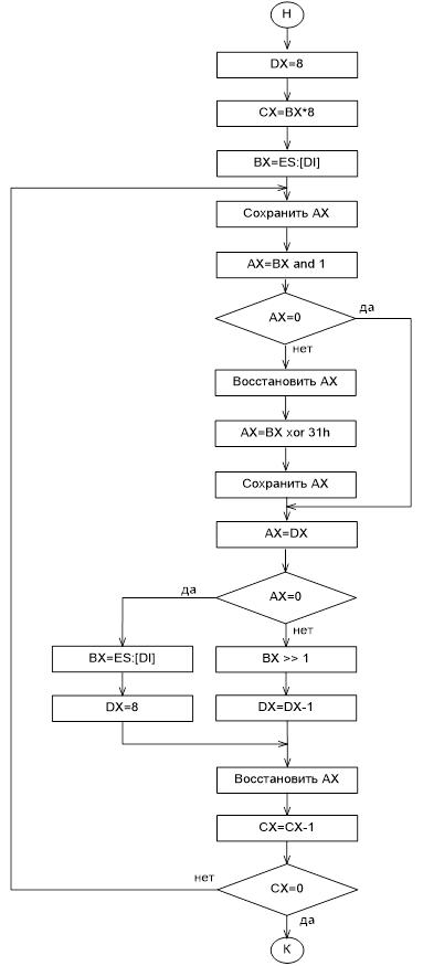 Логические операторы выполняют над выражениями побитовые операции. Выражения должны быть абсолютными, то есть такими, численное значение которых может быть вычислено транслятором. Индексный оператор [ ] . Скобки тоже являются оператором, и транслятор их наличие воспринимает, как указание сложить значение выражение_1 за этими скобками с выражение_2, заключенным в скобки. Оператор переопределения типа ptr применяется для переопределения или уточнения имя типа метки или переменной, определяемых выражением. Тип может принимать одно из следующих значений: byte, word, dword, qword, tbyte, noar, far. Оператор ptr позволяет непосредственно в команде переопределить тип и выполнить команду. Оператор переопределения сегмента : (двоеточие) заставляет вычислять физический адрес относительно конкретно задаваемой сегментной составляющей: «имя сегментного регистра», «имя сегмента» из соответствующей директивы SEGMENT или «имя группы». Оператор именования типа структуры . (точка) также заставляет транслятор производить определенные вычисления Оператор получения сегментной составляющей адреса выражения seg возвращает физический адрес сегмента для выражения, в качестве которого могут выступать метка, переменная, имя сегмента, имя группы или некоторое символическое имя. Оператор получения смещения выражения offset позволяет получить значения смещения выражения в байтах относительно начала того сегмента, в котором выражение определено. 3. ОПИСАНИЕ АЛГОРИТМА Алгоритм реализует вычисление CRC8 делением заданного массива данных на образующий полином x8 +x5 +x4 +1. Деление выполнено последовательным вычитанием по модулю 2 полинома из исходной последовательности. Для этого организован цикл по словам исходной последовательности и цикл по разрядного сдвига внутри слова. Поскольку удобнее просматривать массив в порядке увеличения адреса (от младшего к старшему), процедура реализует зеркальный алгоритм. Подробнее о том как выполняется деление при вычислении CRC смотри в прилагаемых источниках. Для процедуры вычисления исходные данные передаются через регистры. Сегментный регистр ES должен содержать сегмент в котором расположен массив, регистр DX – смещение начала массива внутри сегмента, BX – длина массива. Результат накапливается в аккумуляторе AL. Перед началом вычислений инициируем AX значением FFFFh. В регистр CX заносим длину массива и умножаем её на 8. Таким образом этот регистр хранит количество разрядов в массиве и используется как счётчик циклов командой loop. Дополнять исходную последовательность (проверяемый массив) нулями нет необходимости, т.к. количество разрядов кратно степени образующего многочлена. Смещение переносим в регистр DI. В BX заносим первое слово массива. Проверяем младший разряд BX. Если он равен нулю – выполняем сдвиг слова на один разряд вправо, если нет – выполняем сложение с образующим многочленом по модулю 2, а затем выполняем сдвиг. Сдвиг по разрядам выполняется следующим образом. В DX хранится количество сдвигов оставшееся до конца слова (удобнее подсчитывать не количество выполненных сдвигов, а от количества разрядов в слове до 0). Если в DX – 0, то нужно в DX записать 8, а в BX загрузить следующее слово массива, иначе – просто сдвигаем BX вправо на разряд и уменьшаем DX на 1. Повторяем суммирование. После окончания процедуры аккумулятор AX содержит в