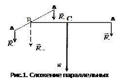 Рассмотрим сложение параллельных сил. Представим, что к трём точкам А1