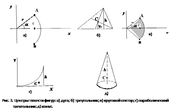 МЕТОДЫ ОПРЕДЕЛЕНИЯ ЦЕНТРОВ ТЯЖЕСТИ (ЦЕНТРОВ МАСС) 1. Метод симметрии. При определении центров тяжести широко используется симметрия тел. Для однородного тела, имеющего плоскость симметрии, центр тяжести находится в плоскости симметрии Аналогично для однородного тела, имею щего ось или центр симметрии, центр масс находится соответственно на оси симметрии или в центре симметрии. Примеры: 1) дуга 2) треугольник – центр пересечения медиан 3) круговой сектор 4) параболический треугольник 5) конус