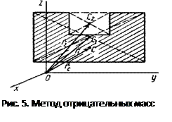 Полученная формула имеет ту же структуру, что и формула, определяющая радиус-вектор центра тяжести тела при разбиении его на элементарные частицы, только в нее входят величины для конечных частей тела. 3. Метод отрицательных масс. Видоизменением метода разбиения на части является метод отрицательных масс. Проиллюстрируем его тоже на примере плоской фигуры (рис. 5). Для определения центра тяжести этой фигуры ее можно разбить на три части. Можно поступить по-другому. Для этого дополним нашу фигуру до прямоугольника и примем, что этот прямоугольник с площадью S 1 и центром масс С 1 полностью заполнен массой (имеет положительную площадь). На той части фигуры, которую добавили, следует распределить отрицательную массу (отрицательную площадь) той же плотности. Площадь этой фигуры с отрицательной массой обозначим S 2 , а ее центр масс – С2 . Применяя метод разбиения на части, радиус-вектор заданной фигуры определим по формуле