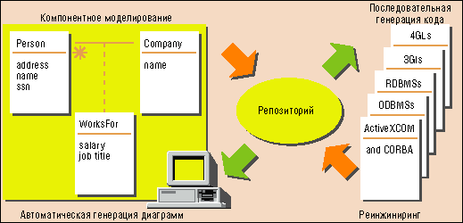 Рис. 3. Циклическое использование моделей Paradigm Plus при создании ИСУП Классификация инструментальных средств Инструментальные средства, предназначенные для моделирования информационных систем, могут быть отнесены к одной из следующих категорий: локальные, поддерживающие один-два типа моделей и методов (Design/IDEF, ProCap, S-Designor, "CASE. Аналитик"); малые интегрированные средства моделирования, поддерживающие несколько типов моделей и методов (ERwin, BPwin); средние интегрированные средства моделирования, поддерживающие от 4 до 10-15 типов моделей и методов (Rational Rose, Paradigm Plus, Designer/2000); крупные интегрированные средства моделирования, поддерживающие более 15 типов моделей и методов (ARIS Toolset). При разработке ИСУП локальные средства моделирования могут быть использованы только на концептуальном уровне для предварительного анализа или как средство демонстрации заказчику общих предложений по будущему проекту. Задача комплексного анализа системы локальными средствами не может быть решена. Малые интегрированные средства моделирования, как правило, "исторически выросли" из локальных. Так же, как и последние, они изначально не были ориентированы на комплексный анализ систем. Возможности по интеграции различных моделей в рамках общей модели появились в процессе совершенствования и развития этих программных средств. Характерными особенностями этой категории является наличие в инструментальном средстве независимых компонентов и интеграция моделей путем экспорта и импорта данных (рис. 1). Типичный представитель малых интегрированных средств моделирования - комплект программных продуктов Platinum Technology (CA/ Platinum/Logic Works), основанный на популярных пакетах BPwin и Erwin.