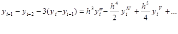и затем перевычисляем значения Отметим, что если пересчёты элементов строк дают значительные расхождения, то этот приём не является надёжным. В таком случае следует или уменьшить шаг h вычислений, или же обратиться к более точным методам. В заключение приведём формулы, обеспечивающие более высокую степень точности, но требующие вычисления, кроме второй, ещё и третьей производной искомого решения. А именно, используя Формулу Тейлера и употребляя приём, аналогичный указанному выше, получаем формулы