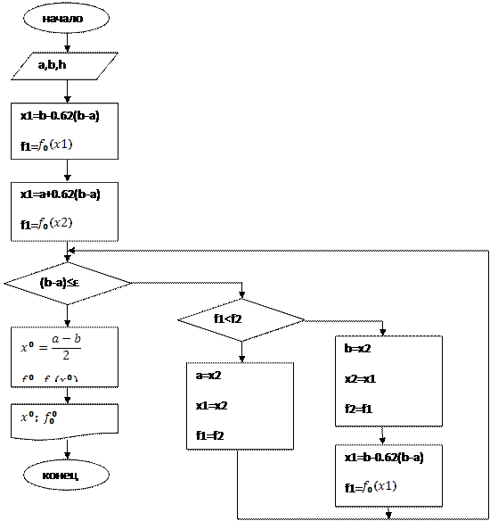 Вывод : преимуществом этого метода над методом дихотомии является то, что на каждом шаге вычисляется лишь одно значение Одномерная оптимизация методом поразрядного приближения. Метод обладает высоким быстродействием. Это достигается тем, что используется алгоритм с переменным шагом поиска. Задаем интервал [