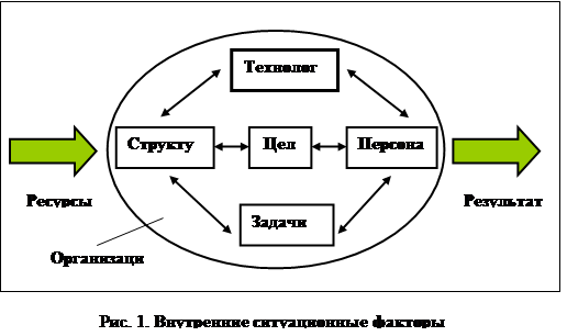 | Реферат Внутренние и внешние переменные управления Ситуационные факторы управленияМенеджер всегда действует в определенной ситуации, которая зависит от множества обстоятельств, или факторов, находящихся как во внешней среде, так и внутри организации. Например, меняется курс национальной валюты, усиливают свои позиции конкуренты, появляются новые технологии производства продукции, меняются вкусы потребителей – это все проявление влияния внешних факторов. Корректируются цели деятельности предприятия, рабочие требуют улучшения условий труда, выходит из строя оборудование, растет число простоев машин – это уже внутренние обстоятельств, которые обязан учитывать менеджер. Факторы непрерывно изменяются, поэтому иначе их называют переменными управления, или ситуационными переменными. Совокупность обстоятельств, в которых действует организация, формируют управленческую ситуацию. В зарубежной управленческой мысли осознание необходимости учитывать переменные управления приходится на конец 50-х годов ХХ века. Этому способствовало развитие системного, а позже ситуационного подходов. Признание значимости внешних и внутренних ситуационных факторов позволило рассматривать организацию как целостность, связанную с внешним миром и состоящую из взаимозависимых частей. Это явилось основой для всестороннего изучения факторов, от которых зависит результативность управления, а также учета синергетического эффекта от их взаимодействия. В отечественной теории и практике переломным стало начало 90-х годов, когда Россия начала осуществлять переход к рыночной экономике. Нашим менеджерам стало понятно, что характер ситуации влияет на принимаемые решения, выбор средств деятельности, объем и содержание перерабатываемой информации. Знание ситуации позволяет менеджеру своевременно отреагировать на нее, принять решения относительно тех факторов, которые представляют наибольшую угрозу для организации, и эффективно использовать позитивные возможности благоприятных обстоятельств. Более того, верные управленческие решения могут предупредить нежелательное сочетание внешних и внутренних переменных, сделать ситуацию предсказуемой и менее опасной для организации. Ситуационные переменные внутри организации Количество внутренних переменных управления в организации велико. Для того, чтобы менеджер более четко представлял области особого внимания при анализе ситуации, к внутренним переменным, как правило, относят пять факторов – цели, структуру, задачи, технологии и персонал организации. Все они тесно связаны между собой (Рис. 2.6). Считается, что знание их состояния и взаимодействия позволяет достаточно полно охарактеризовать внутреннюю управленческую ситуацию. Цели – это направление, в котором должна осуществляться деятельность организации, состояние, к которому она должна стремиться. Цели являются основой для координации всех внутренних переменных управления.