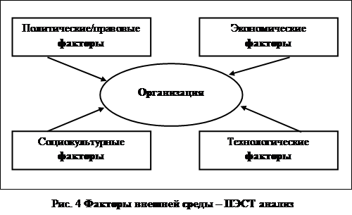 Одним из распространенных содержательных видов исследований внешней среды является ПЭСТ анализ – политический/правовой, экономический, социокультурный и технологический [2, С. 411-413], в котором имеет место несколько иная группировка внешних ситуационных переменных (Рис. 4). Первый шаг анализа начинается с идентификации основных внешних факторов, воздействующих на деятельность организации. Влияние факторов может проявляться по-разному, например: политических/правовых - через трудовое законодательство, налоговую политику, законы об охране окружающей среды, политику приватизации/дерегулирования, формы общественного контроля над расходами и т. п.; экономических – через процентные ставки и уровень инфляции, доверие потребителей, цикл деловой активности, перспективы экономического роста, уровень безработицы, чистый доход после уплаты налогов, издержки заработной платы, конкуренцию, альтернативных поставщиков и пр.; социокультурных – через демографические изменения, развитие системы ценностей общества, перемены в образе жизни (например, изменения состава семей, отношений к работе и к свободному времени), изменения вкусов и предпочтений потребителей (например, отношений к вопросам охраны окружающей среды), уровень образования и пр.; технологических – через потенциал нового продукта, создание нового рынка, альтернативные способы предоставления услуг, новые открытия, уровень отраслевого и государственного финансирования исследований и разработок, изменение коммуникационных технологий, новые производственные технологии, уровень передачи технологий и пр. Цель ПЭСТ анализа заключается не просто в составлении перечня факторов внешней среды, хотя и это очень важно, но в использовании метода для: * выявления изменений или тенденций развития факторов внешней среды; * концентрации внимания на тенденциях, которые имеют наибольшее значение для организации; * учета происходящих перемен при разработке стратегий организации. Данный анализ привлекает внимание к динамической природе внешней среды. Он эффективен для анализа деловой среды крупных, средних и малых предприятий, коммерческих, общественных и добровольных организаций. Отношение менеджера к управленческой ситуации Каждый менеджер для себя ситуацию прорисовывает сам. Один и тот же набор обстоятельств кто-то расценивает как критический, кто-то как вполне нормальный или благоприятный. От чего это зависит? От представлений менеджера, его самоопределения в ситуации. Что-то он выделяет как важное, какие-то факторы опускает, на некоторые обращает незначительное внимание. Так возникает представленческое определение, в результате которого проводится внутренняя граница ситуации. Но можно к объяснению природы ситуации подойти иначе. Ситуация – это машина, в которую попадают – сами (добровольно) или насильно. Обстоятельства принуждают, заставляют человека вести себя определенным образом. Так формируется внешняя граница ситуации. Следовательно, каждая ситуация имеет две границы – внешнюю и внутреннюю. Для менеджера внутренняя граница проходит в самой организации, внешняя – в окружающей среде. Менеджер, благодаря своей активности, может преодолеть машинность, заданность внешней ситуации, не стать ее рабом и противопоставить ей эффективную систему управления. Чем успеш