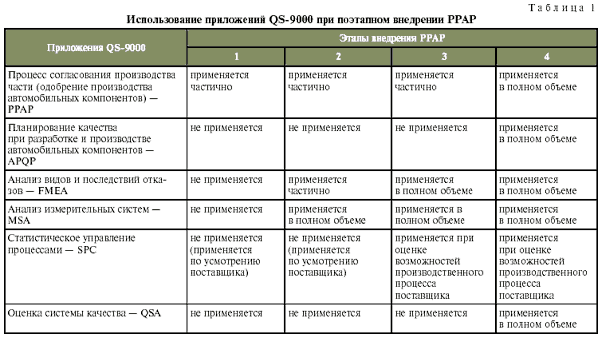 Если мы хотим сохранить отечественное машиностроение, применение современных методов менеджмента качества и, в частности, современных методов управления качеством поставок, должно в самое ближайшее время стать нормой для российских предприятий. На сегодняшний день внедрение в России РРАР в масштабе отрасли сдерживается тем, что не только поставщики, но и многие отечественные предприятия - потребители автомобильных компонентов не готовы к применению этого метода. Прежде чем применить современные методы менеджмента качества в полном объеме, им надо обучить свои технические и коммерческие службы наравне с поставщиками. В этих условиях предъявление со стороны потребителей чрезмерных и заведомо невыполнимых требований к СМК поставщика и качеству поставляемой продукции вынуждает поставщика отвлекать ресурсы на фальсификацию требуемых доказательств. Если сертификация СМК на соответствие требованиям ISO/TS 16949:2000 будет основным требованием потребителя, то, потратив деньги на "ускоренную сертификацию систем качества", поставщик предъявит потребителю необходимые документы и сертификаты, но вероятность реального повышения качества поставляемой продукции в этом случае невелика. Очевидно, что эти деньги и это время могли бы быть использованы поставщиком более эффективно. Потребителю необходимо проявлять гибкость и здравый смысл при формировании требований к своим поставщикам. Нехорошо только требовать от своих поставщиков, потребители должны указывать поставщикам пути повышения качества и помогать в освоении новых методов менеджмента качества. Как убедить поставщиков и потребителей автомобильных компонентов начать освоение этих методов? С чего и каким образом начать это освоение? Как сделать так, чтобы внедрение новых методов не стало фиктивным, проведенным только на бумаге? Для этой цели предлагается использовать справочное руководство PPAP (Процесс одобрения производства автомобильных компонентов). PPAP регламентирует систему, при помощи которой поставщик обеспечивает потребителю уверенность, что все проектные технические данные и требования спецификаций потребителя поняты надлежащим образом и что поставщик способен производить продукцию, соответствующую этим требованиям. Справочное руководство РРАР содержит типовую методологию одобрения производства автомобильного компонента, а также некоторые стандартизованные формы, используемые потребителем и поставщиком в процессе одобрения. Освоение процесса одобрения производства автомобильного компонента (РРАР) поставщиком и потребителем может служить базой для внедрения в отечественную практику проверенных многолетним зарубежным опытом современных методов менеджмента качества. Для ускорения освоения современных методов менеджмента качества авторы предлагают внедрять в отечественную практику процедуру РРАР в четыре этапа (табл. 1). Данное предложение опирается на проект ГОСТ Р "Системы менеджмента качества в автомобилестроении. Одобрение производства автомобильных компонентов" (к сожалению, проект данного документа доступен только в сети Интернет и пока не опубликован в печати) [7]. Начиная с первого этапа, наряду с существующими требованиями по качеству необходимо включать в контракт на поставку автомобильных компонентов требование о реализаци