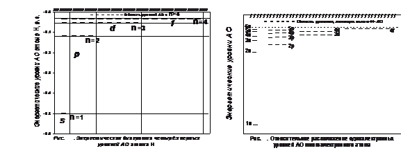 Получается последовательность уровней АО многоэлектронного атома в виде: 1s<2s<2p<3s<3p<4s<3d<4p<5s<4d<5p<6s<4f<5d<6p<7s<5f<6d<7p<8s Иллюстрации: Схемы одноэлектронных уровней – уровней АО водородоподобного иона и многоэлектронного атома.