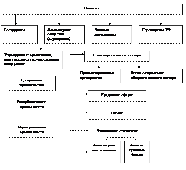 К специфическим функциям рынка ценных бумаг можно отнести следующие: 1 перераспределительную функция, которая в свою очередь может быть разбита на три подфункции: a) перераспределение денежных средств между отраслями и сферами рыночной деятельности; b) перевод сбережений (прежде всего населения) из непроизводственной в производственную форму; c) финансирование дефицита государственного бюджета на неинфляционной основе, т.е. без выпуска в обращение дополнительных денежных средств; 2 функцию страхования ценовых и финансовых рисков (или хеджирование). Данная функция стала возможна благодаря появлению класса производных ценных бумаг: фьючерсных и опционных контрактов. Классификация рынков ценных бумаг. В зависимости от времени и способа поступления ценных бумаг на рынок его можно разделить на первичный и вторичный. Впервые ценные бумаги появляются на первичном рынке, где осуществляется продажа их первым владельцам (инвесторам). Обязательным участником первичного рынка являются эмитенты и инвесторы. Процесс купли-продажи может осуществляться как с помощью, так и без помощи посредников. Именно на первичном рынке эмитенты путем продажи ценных бумаг привлекают средства инвесторов, которые используются для реализации намеченных коммерческих целей. Все последующие операции с ценными бумагами осуществляются на вторичном рынке. Но отличие вторичного рынка ценных бумаг от первичного заключается не только в том, что первичный предшествует вторичному, но и в том, что на этих рынках происходят разные по своей сути процессы. На первичном рынке капитал попадает в руке непосредственно эмитента, а вторичном происходит переход бумаг от одного инвестора к другому. В зависимости от форм организации совершения сделок рынок ценных бумаг делиться на организованный (биржевой) и неорганизованный (внебиржевой). Федеральный закон «О рынке ценных бумаг» устанавливает, что эмитент – это юридическое лицо, группа юридических лиц, связанных между собой договором, или органы государственной власти и органы местного самоуправления, несущие от своего имени обязательства перед инвесторами по осуществлению прав, удостоверенных ценной бумаг.