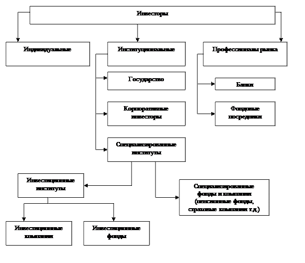 Рис.2. Состав инвесторов Профессиональные участники рынка ценных бумаг. Профессиональные участники рынка ценных бумаг – это юридические лица, в том числе кредитные организации (банк и небанковские кредитные организации), а также физические лица, зарегистрированные в качестве предпринимателей, которые осуществляют виды деятельности, указные в главе 2 Закона «О рынке ценных бумаг». В соответствии сданным законом к профессиональной деятельности на рынке ценных бумаг относятся: 1. Брокерская деятельность. 2. Дилерская деятельность. 3. Деятельность по управлению ценными бумагами. 4. Деятельность по определению взаимных обязательств (клиринг). 5. Деятельность по ведению реестра владельцев ценных бумаг. 6. Депозитарная деятельность. 7. Деятельность по организации торговли ценными бумагами (разновидностью торговля являются фондовые биржи). Профессиональным участникам рынка ценных бумаг нельзя совмещать свою деятельность с другими видами деятельности. Брокерская деятельность – это совершение гражданско-правовых сделок с ценными бумагами в качестве поверенного или комиссионера, действующего на основе договора – поручения или комиссии либо доверенности на совершение таких сделок. Профессиональный участник РЦБ, занимающийся брокерской деятельностью, именуется брокером. Дилерская деятельность – совершение сделок купли-продажи ценных бумаг от своего имени и за свой счет путем публичного объявления цен покупки и/ или продажи определенных ценных бумаг с обязательством покупки и/ или продажи этих ценных бумаг по объявленным ценам. Дилером может быть только юридическое лицо, являющееся коммерческой организации. Клиринговой деятельностью является деятельность по определению взаимных обязательств (сбор, сверка, корректировка информации по сделкам с ценными бумагами) Первая официальная биржа в России появилась при Петре Великом зимой 1703-1704 гг. в Санкт-Петербурге. Затем появилась биржа в Одессе, а в 1816 г. – в Варшаве. Перед революцией крупнейшие фондовые биржи существовали в обеих столицах, а также в Варшаве, Киеве, Одессе, Харькове и Риге. В современной России первые фондовые биржи появились в конце 1990 г., еще до того, как в обращение поступили ценные бумаги, которыми они предполагали торговать. Перед кризисом 1998 г. в России было около 60 фондовых бирж. В 2000 г. их количество сократилось до 15. В настоящее время биржей № 1 в России является Московская межбанковская валютная биржа (ММВБ) – ведущая российская биржа, на основе которой создана общенациональная система торгов на всех основных сегментах финансового рынка – валютном, фондовом и срочном – как в Москве, так и крупнейших финансовых центрах России. На ММВБ проходят торги по акциям более 100 российских эмитентов. Торговля на ММВБ ведется не только непосредственно на самой бирже, но и через региональные биржи, объединенные с ММВБ в единую межрегиональную систему. Фондовая биржа РТС (Российская торговая система) создана в середине 1995г. с целью объединения разрозненных региональных рынков в единый организованный рынок ценных бумаг России. РТС начинала свою работу на программном обеспечении, применявшемся американской NASDAQ, затем разработала собственный программно-технический комплекс, полностью перейдя на него в 1998 г. Изначально в рамках РТС функционировал лишь рынок акций с р
