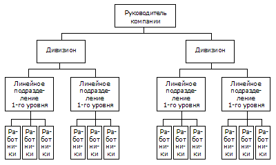 Рис. 1. Линейно-штабная организационная структура 1.3. Дивизиональная структура организации.Решение проблем, возникающих в организации, построенной по линейно-функциональной схеме, было найдено в конце 20-х гг. XX в. с появлением первых дивизиональных структур. Дивизиональная организация вырастает из департамезации (группировки схожих работ) по конечному результату: продукт, потребитель или рынок. Подразделения-дивизионы (стратегические бизнес-подразделения СБП) имеют значительную производственно-хозяйственную самостоятельность при отсутствии статуса юридических лиц. Достоинства: · усиление межфункциональной координации по каждому продукту, рынку и внутри регионов; · рост возможностей получения выгод от экономии на размерах при продуктовой специализации, а также за счет более быстрой реакции на местные запросы и изменение спроса потребителей; · глубокое знание специфики продуктов, рынков, регионов; · возможность создания кадрового резерва для стратегического уровня организации. Недостатки: · введение дополнительных уровней управления между высшим менеджментом и бизнес-единицами; · дублирование ресурсов и функций в аппаратах управления и, как следствие, рост управленческих затрат; · сложность разделения задач между уровнями управления по всей вертикали и в распределении ответственности за результаты; · усложнение централизованной координации между СБП, каждый из которых имеет свою стратегию развития. Область применения: многопродуктовое производство, слабо подверженное колебаниям рыночной конъюнктуры и которое мало зависит от технологических нововведений; многонациональные компании, где территориальная разобщенность вынуждает автономизировать страповые отделения.