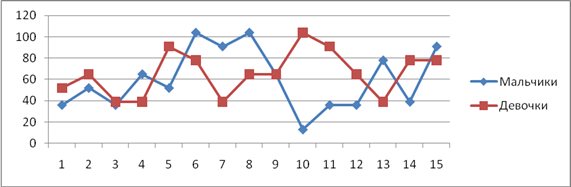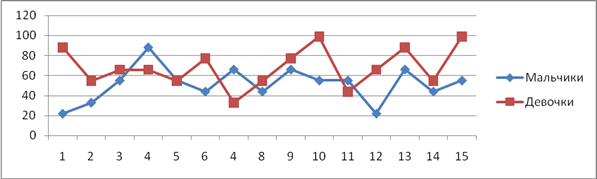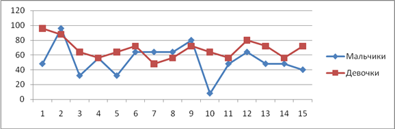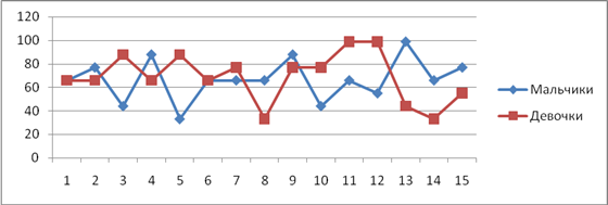 Диаграмма 1 – Физическая агрессия . Из диаграммы видно, что по результатам проведенного нами исследования, данный тип агрессии присущ больше девочкам. А мальчикам же принадлежат низшие уровни физической агрессии. Хотя это противоречит данным, полученным в ходе изучения теоретического материала.
