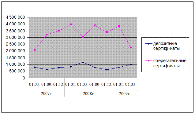 Рисунок 1 – Объем выпущенных депозитных и сберегательных сертификатов Сбербанком России, тыс.руб. Исходя из рис.1, можно сделать следующие выводы: наибольшее количество депозитных сертификатов было выпушено в марте 2008г., а наименьшее количество – в декабре 2008г. В целом выпуск депозитных сертификатов за анализируемый период не колебался, был практически на одном уровне, чего не скажешь о сберегательных сертификатах. Наибольший объем выпушенных сберегательных сертификатов наблюдается в январе и сентябре 2008г., а наименьший объем – в марте 2007г.