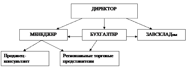 Рисунок 1 – Управление в организации. Должностная инструкция – нормативный акт, которым определены функции, должностные обязанности, права и ответственность сотрудников, принятых на работу. Директор руководит деятельностью подразделения и отвечает за сохранность и безопасность имущества подразделения, вверенных подразделению материальных ценностей, своевременность и правильность составления бухгалтерской и иной документации, моральный климат в коллективе. По утвержденной должностной инструкции директор обязан: · правильно вести документооборот и бухгалтерский учет в подразделении; · организовывать надлежащим образом охрану и сохранность товара и имущества подразделения; · постоянно вести контроль движения денежных средств и о каких-либо нарушениях немедленно сообщать непосредственному руководителю. · не разглашать сведения, составляющие коммерческую тайну; · немедленно (не позднее 1 часа) сообщать непосредственному руководителю обо всех происшествиях, в том числе о проведении проверок любым государственным органом. · при приеме на работу сотрудников: - требовать заполнения анкеты кандидата; - требовать предоставление ксерокопий паспортов; - согласовать прием в службе безопасности; - заключить трудовой договор (контракт) сроком на 6 месяцев с испытательным сроком 3 месяца; - согласовывать с Обществом заработную плату сотрудника; · при увольнении сотрудников: - напомнить сотруднику о его обязательстве по сохранению коммерческой тайны, не работать в течение года после увольнения в организации со сходным профилем деятельности; - произвести окончательный расчет с увольняемым сотрудником после полного оформления обходного листа; - сразу после увольнения прекратить допуск сотрудника на территорию подразделения. - следить за моральным состоянием сотрудников и о каких-либо происшествиях сообщать в течение дня непосредственному руководителю. · вести и постоянно обновлять сведения о клиентах и направлять их Обществу; · заключать договоры с условием об отсрочке платежа или с условием об оплате товара по его реализации только после сбора всей необходимой информации о клиенте и получения разрешения непосредственного руководителя; · согласовать с непосредственным руководителем размер товарного кредита и срок отсрочки платежа по договорам поставки по каждому клиенту; · следить за выполнением клиентами условий договоров, о нарушениях сообщать непосредственному руководителю в течение двух календарных дней; · не реже одного раза в неделю осуществлять проверку местонахождения клиентов, имеющих задолженность по оплате товара посещением, не реже 1 раза в 2 календарных дня обзванивать данных клиентов; · не реже одного раза в месяц проводить инвентаризацию склада, акт инвентаризации предоставлять непосредственному руководителю до 5-го числа каждого месяца; · своевременно предоставлять в Общество отчетную документацию (Форма 3, Форма «Товар, реализованный контрагентам», Форма «Отгружено товара», Форма «Товар в кредите»). Должностная инструкция бухгалтера. Бухгалтер обязуется: · осуществлять ведения бухгалтерского учета операций по счетам платежей/денежных средств, а также других финансовых операций, · составлять финансовые отчеты за определенный период главному бухгалтеру предприятия · работать с поставщик