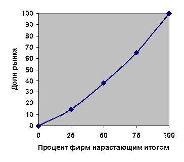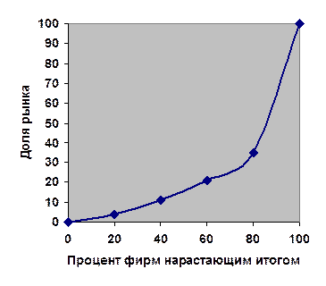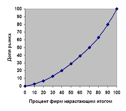 где Этот показатель определяет неравномерность распределения долей между участниками рынка. Чем больше неравномерность распределения долей, тем при прочих равных условиях более концентрированным является рынок. В нашем случае полученное значение показателя дисперсии подтверждает высокую концентрацию продавцов на рынке. Построим для рынка кривую Лоренца, которая показывает взаимосвязь между процентом фирм на рынке и долей рынка, подсчитанной нарастающим итогом, от мельчайших до крупнейших фирм (рис. 2).