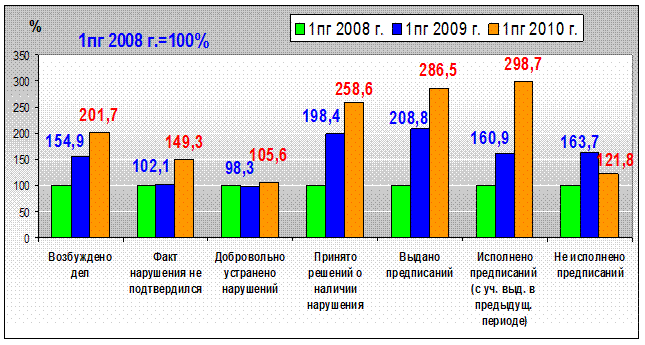 Рис. 3. Динамика количества дел о нарушении антимонопольного законодательства, возбуждённых ФАС России. На рис. 4 показаны результаты работы ФАС России в 2008 – 2010 гг. по выявлению нарушений антимонопольного законодательства по возбужденным делам.