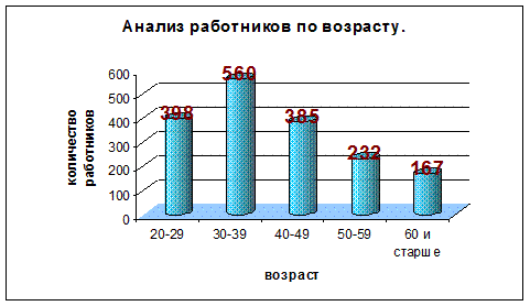 Табл.4. Вывод: значительная часть работников предприятия – женщины. Для предприятий текстильной промышленности это является характерным. Однако это несколько увеличивает расходы предприятия, связанные с социальными выплатами ( больничные по уходу за детьми ). Анализ работников по возрасту.