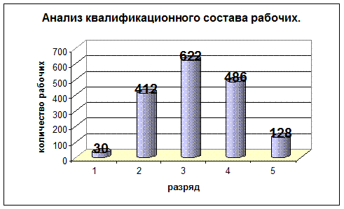 Табл.5. Вывод: значительная часть от общей численности работников (32,147%) являются работниками в возрасте от 30-39 лет. Это является положительным фактором, так как работники раннего возраста не обладают достаточными практическими навыками, что понижает производительность труда. Работники более старшего возраста, обладая практическими навыками, имеют пониженную производительность труда. Поэтому то соотношение, которое имеется на предприятии, является благоприятным. Анализ квалификационного состава рабочих.