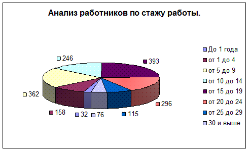Табл.6. Средний тарифный разряд рабочих является обобщающей оценкой уровня их квалификации. Данные о среднем тарифном разряде необходимы также для определения соответствия их квалификации сложности выполняемой работы. Средний тарифный разряд:(30*1+412*2+622*3+486*4+128*5)/1678=3,16 Вывод: средний разряд работников равен 3,16, что говорит о том, что работникам следует поднимать свою квалификацию. Анализ работников по стажу работы.