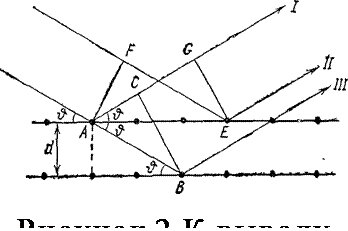 Кристалл можно представить состоящим из семейства параллельных плоскостей, находящихся на одинаковом расстоянии в друг от друга. Предполагается, что число атомных плоскостей данного семейства велико и преломление в кристалле отсутствует. Пусть на кристалл надает параллельный пучок монохроматических (определенной длины волны λ) рентгеновских лучей под некоторым углом скольжения υ по отношению к атомной плоскости кристалла. Лучи параллельного пучка отражаются от атомных плоскостей под одним и тем же углом υ. Разность хода лучей и, отраженных от одной и той же плоскости равна нулю, так как в = AG - FE = 0, т. с. эти лучи находятся в одной фазе. Проникая в толщу кристалла, лучи встречают параллельные атомные плоскости под углом υ. Отраженные под этим же углом υ параллельные лучи интерферируют, т. е. усиливают или ослабляют друг друга в зависимости от разности хода в между ними Исходя из векторного уравнения, путем простого геометрического рассмотрения в ОАС можно получить скалярное уравнение: