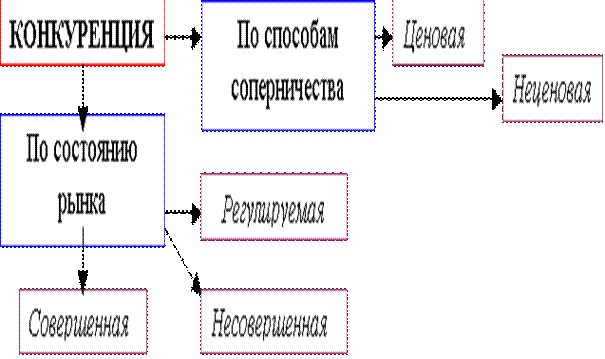Существует множество критериев и подходов к классификации конкуренции. - Исходя из степени дифференциации товара конкуренция подразделяется на однородную, гомогенную (без дифференциации), и разнородную, гетерогенную (с дифференциацией). - Конкуренция подразделяется на открытую, закрытую и полузакрытую, если учитывать степень свободного проникновения в отрасль. - Поскольку конкуренты способны очень сильно влиять на выбор фирмой того или иного рынка, на котором она будет пытаться работать, можно выделить конкуренцию трех видов: - Функциональная конкуренция возникает потому, что любую потребность, вообще говоря, можно удовлетворить совершенно различными способами. И, соответственно, все товары, обеспечивающие такое удовлетворение, являются функциональными конкурентами: находящиеся в магазине спортивных принадлежностей изделия, например, именно таковы. Функциональную конкуренцию приходится учитывать, даже если фирма является производителем поистине уникального товара. Видовая конкуренция – следствие того, что имеются товары, предназначенные для одной и той же цели, но различающиеся каким-то важным параметром. Таковы, например, легковые 5-и местные автомобили одного класса, но с разными по мощности двигателями. Предметная конкуренция – результат того, что фирмы выпускают, по сути, идентичные товары, различающиеся лишь качеством изготовления или даже одинаковые по качеству. Такая конкуренция иногда называется межфирменной, что в некоторых случаях верно, однако, следует иметь в виду, что межфирменными обычно являются и два других вида конкуренции. В зависимости от степени антагонизма выделяют конкуренцию без крайностей и с нарушением норм действующего законодательства И, наконец, самая популярная классификация: по состоянию рынка и по способам соперничества. Таким образом, мы дали определение конкуренции, раскрыли некоторые ее функции и выделили несколько критериев и подходов к классификации конкуренции. Последняя схема, показывающая классификацию конкуренции по способам соперничества и состоянию рынка, будет взята нами за основу при рассмотрении видов конкуренции в последующих главах. 1.3 Ценовая и неценовая конкуренция