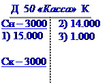 Пример отражения на счетах хозяйственных операций. Составить бухгалтерские проводки и отразить на счетах 50 «Касса», 70 «Расчеты с персоналом по оплате труда», 51 «Расчетный счет» следующие хозяйственные операции, зная, что Сн по счету 50 = 3.000, по счету 70 = 15.000, по счету 51 = 100.000. 1. В кассу поступили средства с расчетного для выдачи заработной платы в размере 15.000 р. Д50 К51 – 15.000 +А «Касса» (Д50) –А «Расчетный счет» (К51) 2. Из кассы выдана заработная плата работникам предприятия 14.000 р. Д70 К50 – 14.000 –А «Касса» (К50) –П «Расчеты с персоналом по оплате труда» (Д70) 3. Сдана на расчетный счет сверхлимитная сумма из кассы 1.000 р. Д51 К50 – 1.000 +А «Расчетный счет» (Д51) –А «Касса» (К50)
