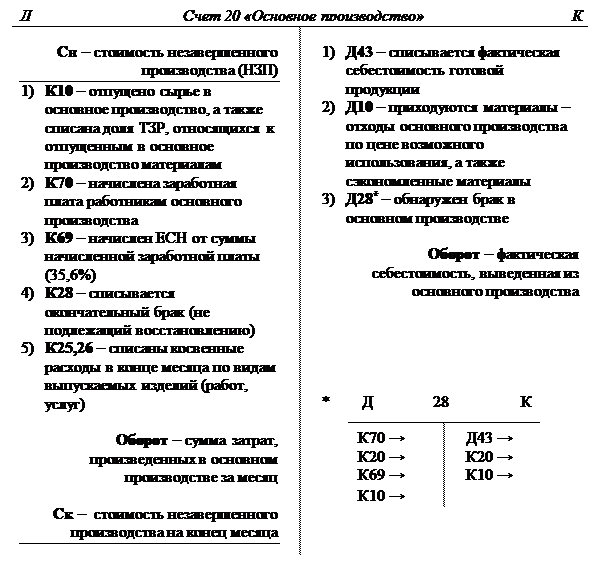При поступлении материалов (работ, услуг) от поставщиков в платежных документах указывается и сумма НДС, которая добавляется к договорной стоимости приобретения материалов или входит составной частью (в том числе в договорную стоимость приобретенных материальных ценностей). Поставщику необходимо заплатить помимо стоимости материалов также НДС и общая сумма долга поставщику отразится по кредиту счета 60. например, если поступили материалы от поставщиков по договорной цене 300.000 рублей в том числе 18 НДС, то эта хозяйственная операция отразится проводкой: Д10К60 254.237 Д19К60 45.763 Для выделения НДС из договорной цены общая сумма договорной цены умножается на 18 и делится на 118 или умножают на коэффициент 0,1525. Дебет счета 19 показывает дебиторскую задолженность бюджета перед нашим предприятием. Дебет 19 возникает. Когда мы платим (перечисляем) деньги с расчетного счета и приходуем в своем учете материалы (работы, услуги). Налоговые вычеты по НДС НДС, учтенный по дебету счета 19 может быть взят в зачет, или могут быть произведены налоговые вычеты, или списан входной НДС в уменьшение долга бюджету проводкой Д68 К19 при соблюдении всех следующих условий: 1. материалы, работы, услуги предназначены для производственных целей (идут на производство продукции и ее продажу); 2. материалы, работы, услуги оприходованы; 3. материалы, работы, услуги оплачены; 4. имеется счет-фактура по НДС. 2. Учет процесса производства – расходов по обычным идам деятельностиВо время изготовления продукции (выполнения работ, оказания услуг) предприятие затрачивает определенные средства (сырье, материалы, заработную плату, налоги, расходы на содержание зданий и сооружений и прочие расходы). Эти затраты делятся в зависимости от способа включения в себестоимость на прямые и косвенные . К прямым затратам относят расходы, которые непосредственно включаются в стоимость изготавливаемой продукции, то есть сырье. Материалы, топливо, энергия, заработная плата, налоги и прочие затраты. К косвенным затратам относят расходы, которые непосредственно не включаются в себестоимость определенного вида продукции, но они способствуют процессу изготовления продукции. Это расходы по эксплуатации машин и оборудования, расходы по содержанию цехов, по содержанию аппарата управления предприятием. Учет прямых затрат ведется на активном, калькуляционном счете 20 «Основное производство». Все затраты собираются по дебету счета 20. Сальдо начальное по счету 20 показывает незавершенное производство, которое получено в результате инвентаризации, проведенной в последнюю смену месяца (или другим методом). По документам определяются затраты, вошедшие в выпуск продукции, результат от которых будет только в следующем месяце. Рассмотрим графически счет 20 «Основное производство»