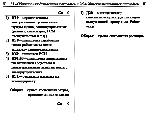 После отражения всех затрат на счете 20 расчитывают фактическую себестоимость готовой продукции по следующей формуле: С/сФакт ГП = Сн20 + Об Д20 – Ск20 – Экономия(Д10 К20) – Брак(Д28 К20) Учет косвенных расходов ведется на счетах 25 «Общепроизводственные расходы», где отражаются расходы по цехам и счете 26 «Общехозяйственные расходы», который предназначен для учета затрет по содержанию аппарата управления предприятием. Эти счета активные, по дебету этих счетов собираются расходы, которые в конце месяца списываются в основное производство, то есть сальдо эти счета не имеют: Д20 К25,26 Распределение косвенных расходов по видам выпускаемой продукции, работ, услуг может осуществляется пропорционально: 1. основной заработной плате производственных рабочих; 2. себестоимости продаж; 3. объему дохода каждого вида продукции, работ, услуг; 4. в плановом проценте. Выбранный метод распределения является элементом учетной политики. Счет 26 также может быть списан в дебет счета 90 «Продажи» – элемент учетной политики. Счет 25 ведется, когда отдельные цеха производства имеют большие размеры и обособлены. Рассмотрим графически счета 25 «Общепроизводственные расходы» и 26 «Общехозяйственные расходы»