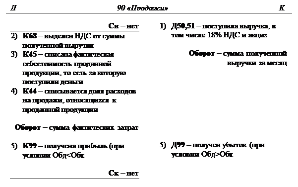 Учет продаж (реализации) Продукция считается проданной, если деньги за нее поступили на расчетный счет организации или в кассу. Сумма, поступившая на расчетный счет или в кассу, называется выручкой от реализации или доходом от обычных видов деятельности . Продажи продукции учитываются на счете 90 «Продажи». Сальдо начальное и конечное счет не имеет. Обороты дебету счета 90 показывают: 1. фактическую себестоимость реализованной продукции: Д90 К45 2. сумму коммерческих расходов на продажи, относящиеся к проданной продукции: Д90 К44 3. начисленный налог на добавленную стоимость, который поступает в составе выручки на расчетный счет или в кассу организации: Д50,51 К90 – поступление выручки и который необходимо выделить из полученной суммы выручки, умножив ее на 18 и разделив на 118: Д90 К68 – выделен НДС с реализации Обороты по кредиту счета 90 показывают полученную выручку – доход от реализации продукции, в том числе НДС: Д50,51 К90 В конце месяца сопоставляются обороты по дебету и кредиту счета 90: 1. если выручка – доход, полученный от покупателя превышает фактические затраты предприятия по изготовлению продукции, то предприятие получает прибыль, которая отражается проводкой: Д90 К99 2. если фактические затраты превысили сумму выручки, то предприятие получает (несет) убыток , который отражается проводкой: Д99 К90
